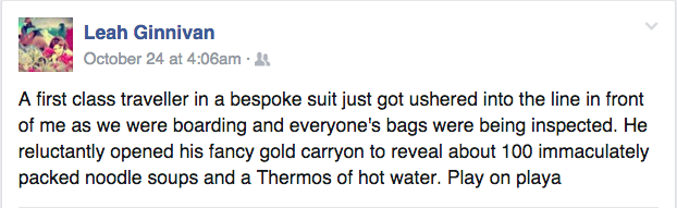 A first class traveller in a bespoke suit just got ushered into the line in front of me as we were boarding and everyone's bags were being inspected. He reluctantly opened his fancy gold carryon to reveal about 100 immaculately packed noodle soups and a Thermos of hot water. Play on playa -Leah Ginnivan
