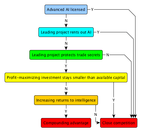 If a large component of AI progress is project-specific and not available for purchase, then the foremost AI projects will have access to a resource that it is difficult for competitors to replicate. This would make catch-up efforts difficult but not necessarily impossible, especially if there are diminishing gains to intelligence at any given level of economic progress. If most AI progress is project specific, then it is plausible that at some point a leading project could convert from a wealth-maximizing to an intelligence-maximizing strategy, reallocating all of its AI output to self-improvement, and thus achieving very rapid gains over the competition at a sustainable cost for a substantial amount of time, sufficient to establish a singleton.