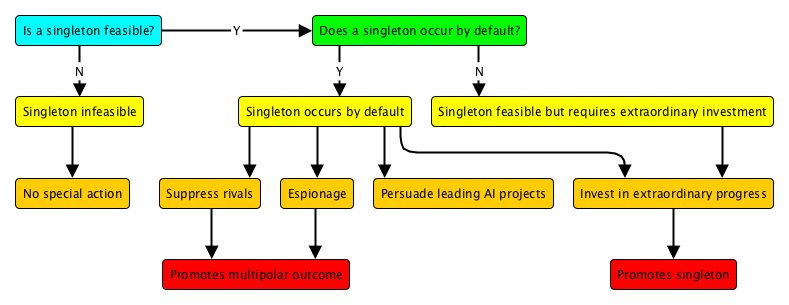 - If a singleton is likely to occur by default, then an agent with foresight is likely to want to impede other AI projects, accelerate its own, or identify the leading projects and persuade them to use their AI to satisfy that agent’s goals.